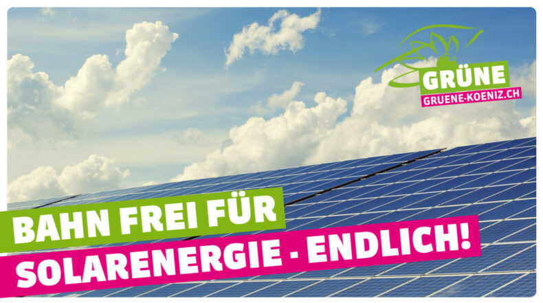 Die Grünen und Jungen Grünen Köniz freuen sich über den Erfolg ihrer Motion und den raschen Entscheid des Gemeinderates, endlich bürokratische Hindernisse für die Energiewende und die Förderung der Solarenergie in den Überbauungsordnungen zu beseitigen.