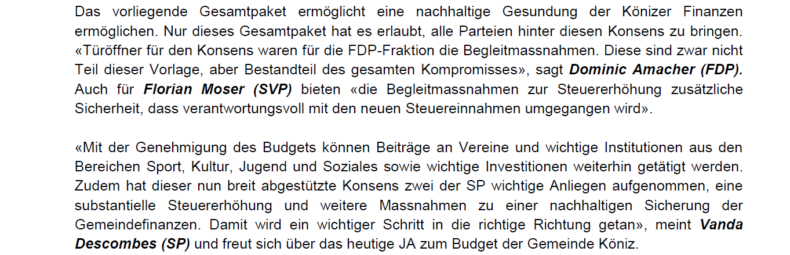 Die Grünen sind sehr erfreut, dass die Könizer Stimmbevölkerung das Budget 2022 mit 69.7% deutlich angenommen hat. Dank dem breit getragenen Kompromiss kann damit die lange notwendige Steuererhöhung endlich erfolgen. Erfreulich ist auch, dass damit der budgetlose Zustand beendet werden kann. Die finanzielle Situation bleibt jedoch angespannt und die Grünen Köniz werden sich weiterhin dafür einsetzen, dass notwendige Investitionen in den Klimaschutz und die soziale Gerechtigkeit getätigt werden können.